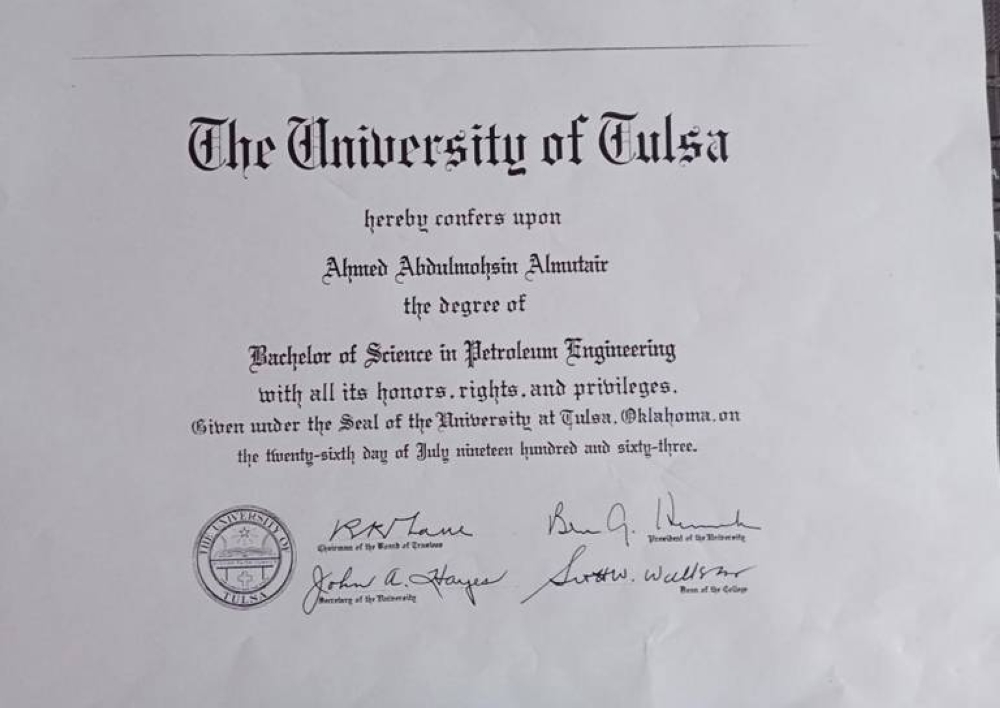 انتقل المطير بعد مُضيّ سنتين إلى جامعة تالسا (University of Tulsa) بولاية أوكلاهوما، وأكمل دراسته فيها، حتى تخرَّج بتخصص هندسة البترول عام 1963.