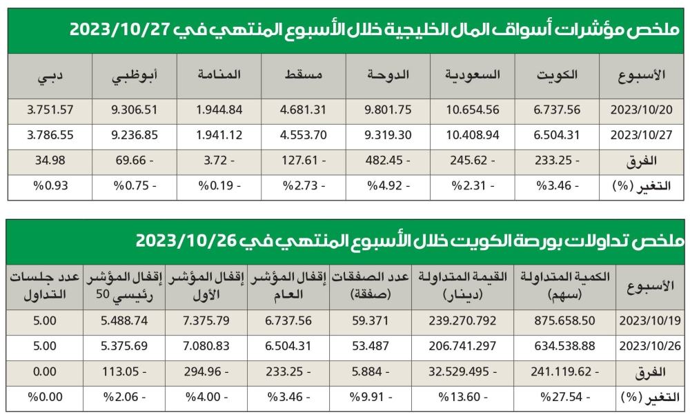 • الكويتي يتراجع 3.5% والعماني 2.7% والسعودي 2.3% وانخفاض أبوظبي والبحرين بنسب أقل
