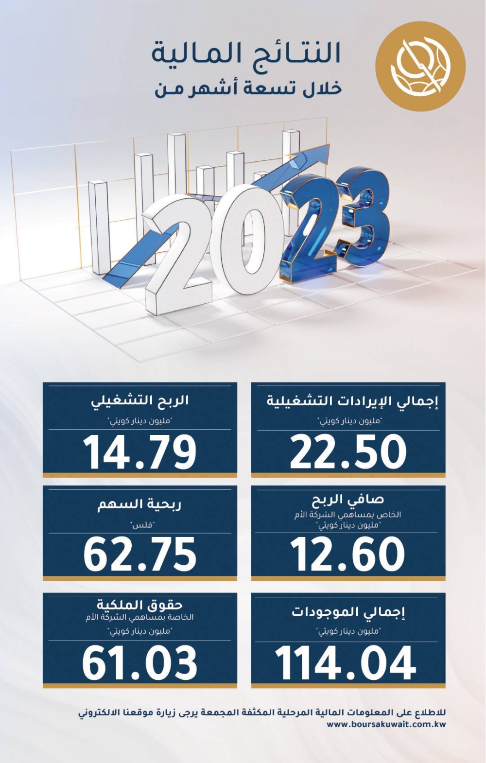 أعلنت بورصة الكويت في اجتماع مجلس إدارتها المنعقد في 31 أكتوبر 2023 نتائجها المالية لفترة الأشهر الـ9 المنتهية في 30 سبتمبر 2023، حيث سجلت الشركة صافي ربح قدره نحو 12.60 مليون دينار، بتراجع على أساس سنوي نسبته 16.51 في المئة مقارنة بنفس الفترة من 2022، ويعود سبب الانخفاض في صافي الربح إلى تراجع الإيرادات التشغيلية نتيجة انخفاض أنشطة التداول.