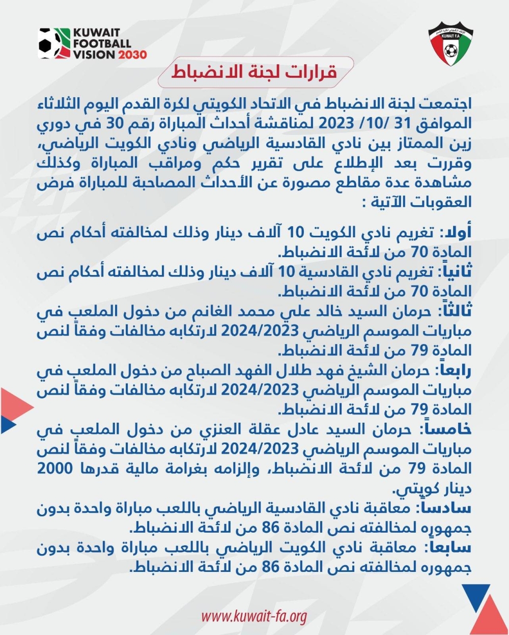 أصدرت لجنة الانضباط في الاتحاد الكويتي لكرة القدم في اجتماعها الذي عقدته اليوم لمناقشة أحداث المباراة في دوري زين الممتاز بين ناديي القادسية والكويت مجموعة من القرارات بعد الإطلاع على تقرير حكم ومراقب المباراة وكذلك مشاهدة عدة مقاطع مصورة عن الأحداث المصاحبة للمباراة.