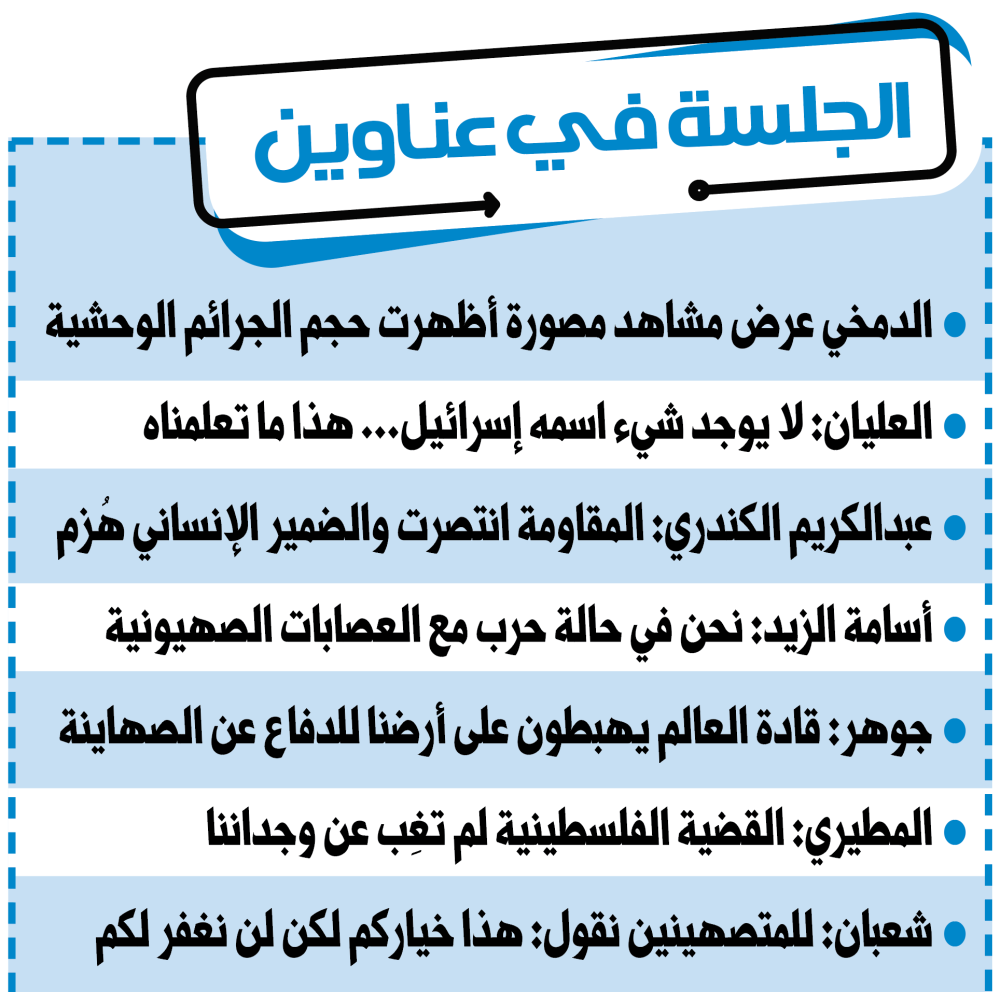 بينما قال النائب متعب الرثعان ان الكيان الصهيوني يمارس الابادة في غزة، ويستخدم أسلحة محرمة دوليا، واليوم علينا جميعا الا نغفل عن مخططات الكيان الصهيوني التي تستهدف المنطقة والوصول إلى شرق اوسط جديد.
