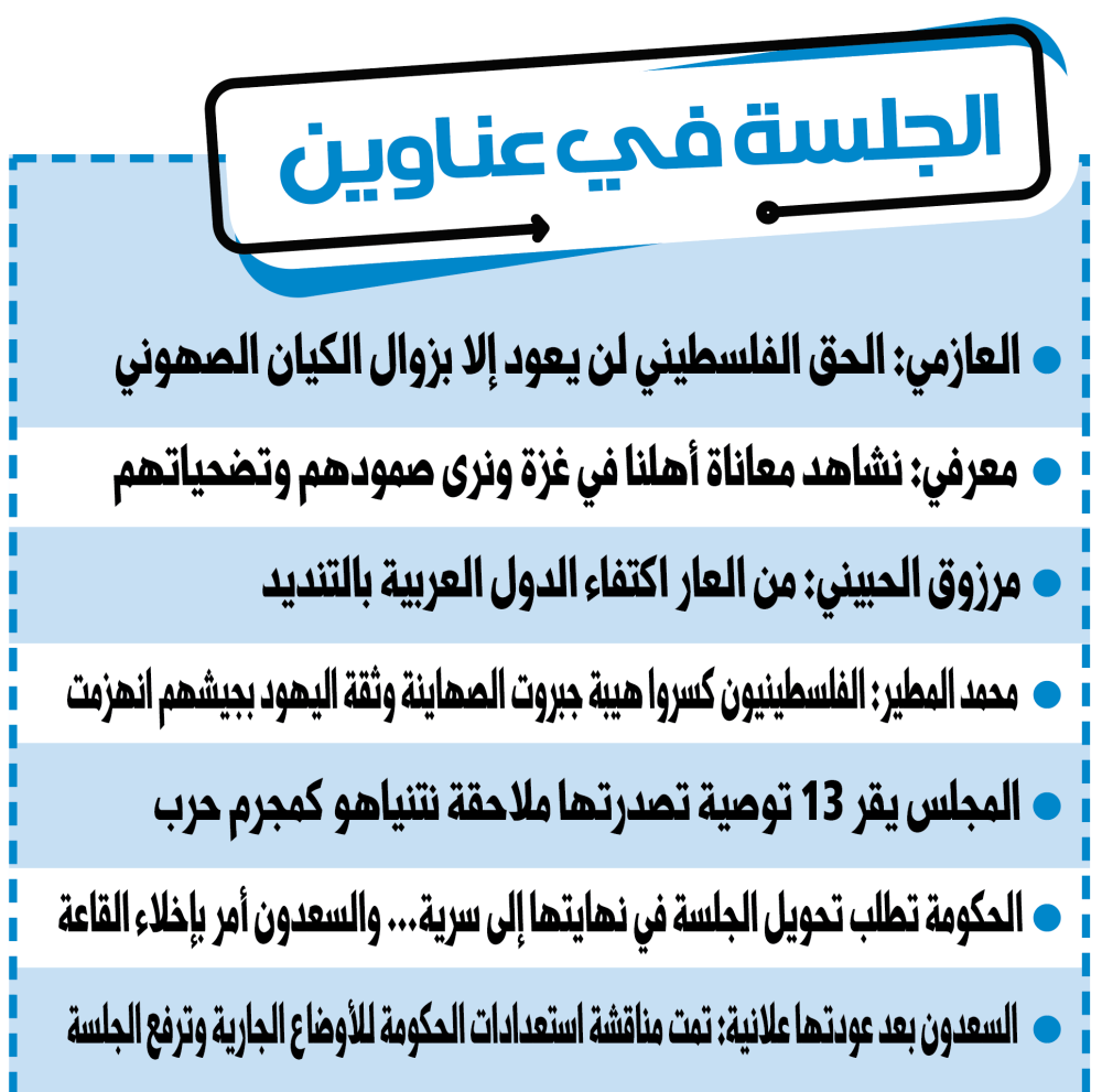 وألقى النائب حمد المطر التحية على الشعب الفلسطينى الحر، مشيرا بقوله: نجدد رفضنا لكل اشكال التطبيع مع الكيان الصهيونى ودمجه في الكيان الاقليمي، وهناك العديد من التوصيات سنقدمها مع مجموعة من الاعضاء في نهاية الجلسة.