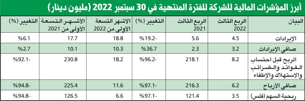 وقد سجلت الشركة في الربع الثالث من 2022 صافي ربح قدره 6.2 ملايين دينار، أي ما يعادل 3.52 فلوس لكل سهم، وإيرادات تشغيلية قدرها 4.5 ملايين دينار.