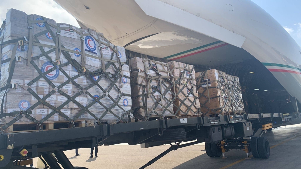 ووصلت حتى الآن عشر طائرات تنقل أطناناً من المساعدات الإنسانية إلى مطار العريش في محافظة شمال سيناء المصرية حيث بلغت حمولتها الإجمالية 280 طناً تضم مواد غذائية ومستلزمات طبية وخياماً ومعدات لتوليد الطاقة بالإضافة إلى عدد من سيارات الإسعاف المجهزة وسيارات الحفر.