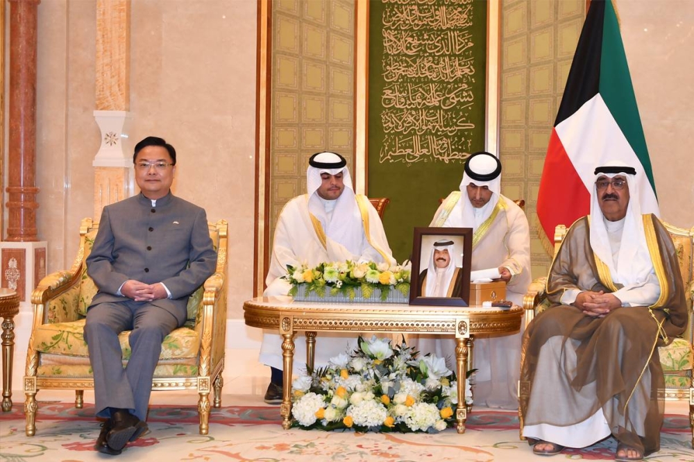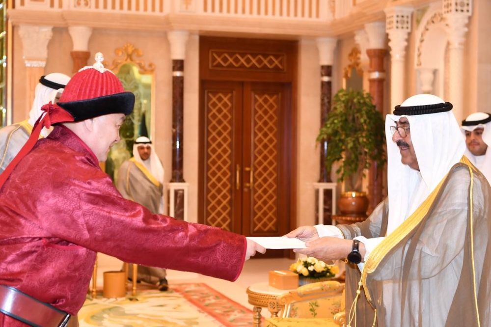 سمو ولي العهد الشيخ مشعل الأحمد خلال تسلمه أوراق اعتماد سفير الصين