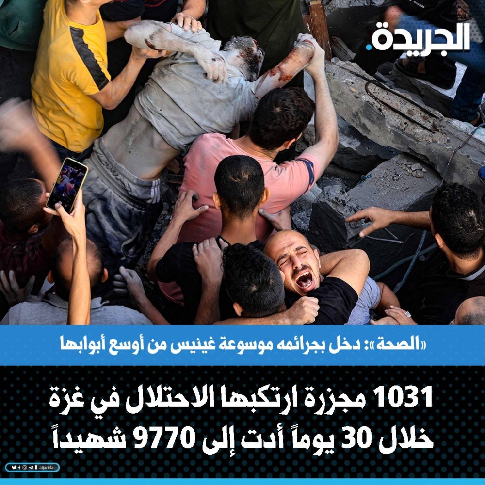 وقال القدرة إن إسرائيل ارتكبت 1031 مجزرة بحق العوائل الفلسطينية بما يمثل إبادة جماعية لكل قطاع غزة ما أسفر عن 9770 شهيداً منذ السابع من الشهر الماضي.