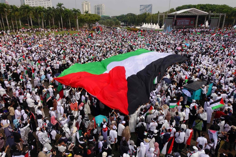 وارتدى المتظاهرون ملابس باللونين الأبيض والأحمر، ووشاحا باللونين الأبيض والأخضر، لإظهار التضامن مع فلسطين، أثناء تجمّعهم حول المنصة الرئيسية في ميدان النصب التذكاري الوطني، مقابل القصر الرئاسي. ومن بين المشاركين في الفعاليات مسؤولون، مثل رئيسة البرلمان بوان ماهاراني، ووزيرة الخارجية ريتنو مارسودي، ووزير الشؤون الدينية ياقوت خليل قوماس، إضافة إلى المرشح الرئاسي أنيس باسويدان.