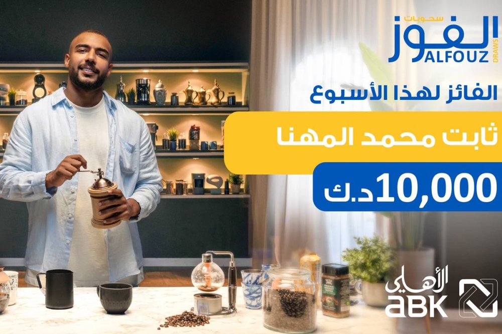 أعلن البنك الأهلي الكويتي فوز ثابت محمد المهنا في السحب الأسبوعي لحساب الفوز للجوائز، بجائزة نقدية قدرها 10 آلاف دينار، وقد أقيم السحب تحت إشراف وزارة التجارة والصناعة، وتم إعلان اسم الفائز اليوم.