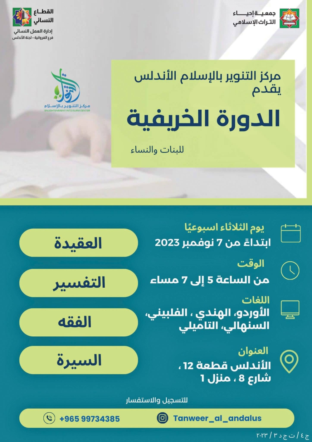 يطلق القطاع النسائي بجمعية إحياء التراث الإسلامي، موسماً ثقافياً نسائياً حافلاً يتضمن محاضرات وفعاليات للنساء والفتيات، وللجاليات الأجنبية.