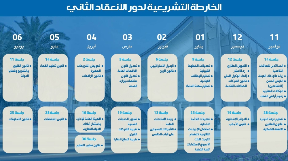 • 37 قانوناً وُزِّعت على 17 جلسة تبدأ من الثلاثاء المقبل وتنتهي 25 يونيو العام القادم