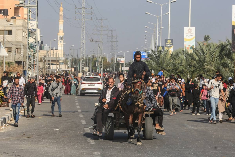 فلسطينيون يغادرون غزة سيراً على الأقدام باتجاه جنوب القطاع أمس (أ ف ب)
