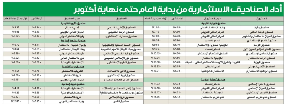 عكست الصناديق المحلية الاستثمارية الأداء السلبي للسوق وحالة الجمود، إذ عمّقت خسائر أكتوبر الماضي ما تكبدته الصناديق من خسائر منذ بداية العام لفترة عشرة أشهر نتيجة الضغوط النفسية الآتية من الخارج، وعدم الاستقرار السياسي عالمياً، وغياب المبادرات في السوق.