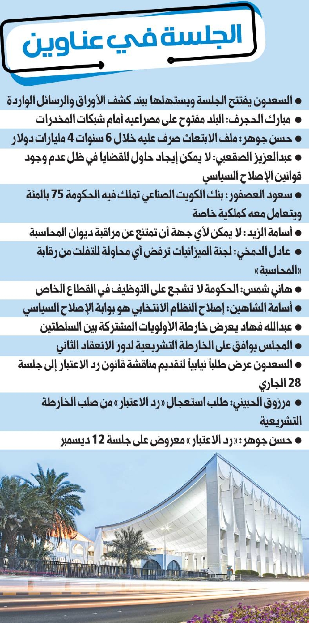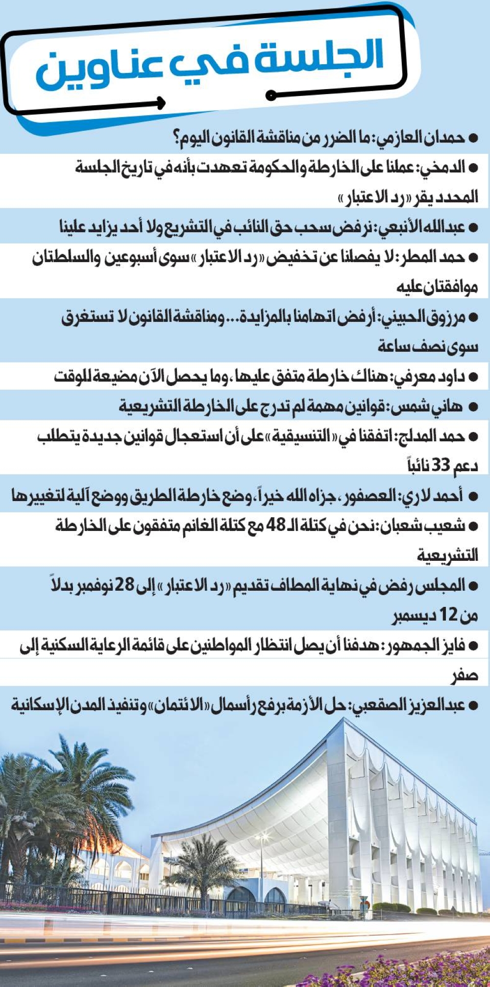 وبعد عرض رئيس لجنة الأولويات عبدالله فهاد خارطة الأولويات المشتركة بين السلطتين، وافق المجلس على الخارطة التشريعية، ثم عرض السعدون طلبا نيابيا لتقديم مناقشة قانون رد الاعتبار، الذي تقدم به مجموعة من النواب لأهميته على حد قولهم، ليكون في جلسة 28 الجاري بدلا من 12 ديسمبر المقبل.