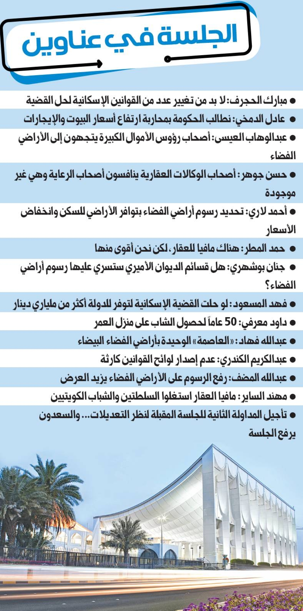 وقال مقرر اللجنة الإسكانية، عبدالعزيز الصقعبي: نظرا لطلبات النواب ونزولا عند رغبتهم بتقديم تعديلاتهم على تقريرَي الأراضي الفضاء والوكالات العقارية، نطلب تأجيل المداولة الثانية للجلسة القادمة على أن يقدموا اقتراحتهم في موعد أقصاه الاثنين المقبل، لنجتمع يوم الثلاثاء لإنجاز التعديلات المقترحة، وعليه، وافق المجلس على تأجيل المداولة الثانية للوكالات العقارية وتنظيم الأراضي الفضاء للجلسة القادمة، ليرفع بعدها الرئيس السعدون الجلسة الى 28 الجاري.