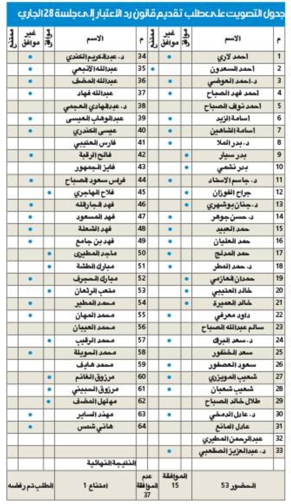 ورفض المجلس في نهاية المطاف تقديم «رد الاعتبار» إلى 28 نوفمبر بدلا من 12 ديسمبر، بعد موافقة 15 نائبا، ورفض 37 من أصل 53 نائبا وممتنع واحد.