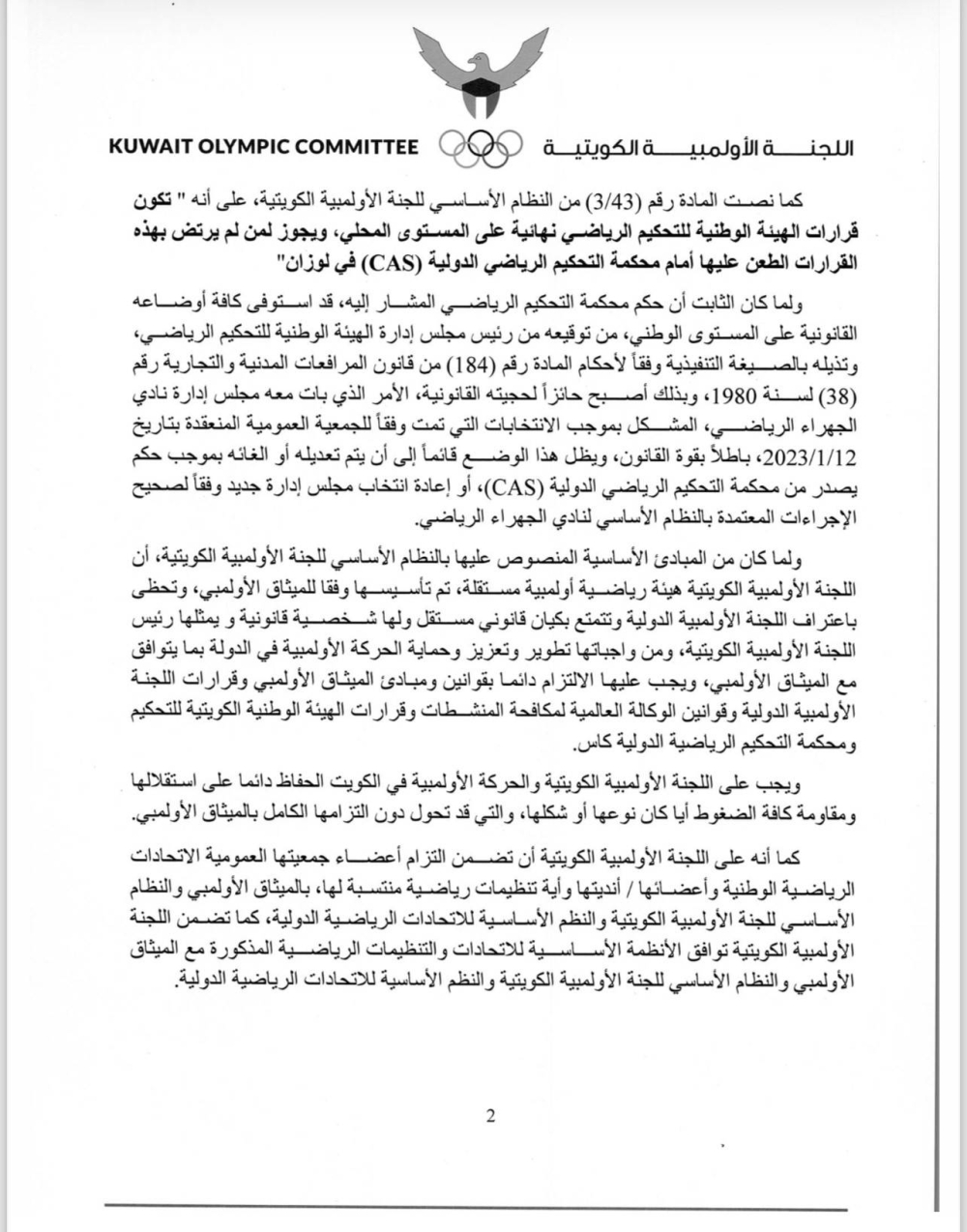وتابعت: «كما نصت المادة 3 - 34 من النظام الأساسي للجنة الأولمبية الكويتية على أن (قرارات هيئة التحكيم الرياضية نهائية على المستوى المحلي، ويجوز لمن لم يرتضِ بالأحكام الطعن عليها أمام «كاس»).