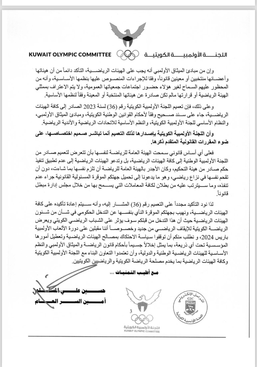 ووجهت اللجنة في تعميمها تساؤلاً عن الأساس القانوني الذي سمحت الهيئة العامة للرياضة لنفسها بأن تتعرض لتعميم صادر من «الأولمبية» الكويتية إلى الهيئات الرياضة، مؤكدة أنه «كان يتعين عليها أن تلزم نفسها بما شاءت، دون أن تقحم نفسها في نزاع رياضي».