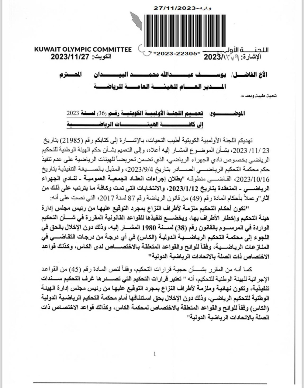 أرسلت اللجنة الأولمبية الكويتية كتاباً إلى جميع الهيئات الرياضية بشأن حكم الهيئة الوطنية للتحكيم الرياضي، القاضي بإبطال عمومية نادي الجهراء المنعقدة بتاريخ 12 يناير الماضي، وما ترتب عليها من آثار، ومن بينها الانتخابات التي جاءت بمجلس الإدارة الحالي.