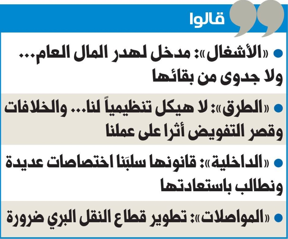 - عدم وجود نظام مالي يحكم عملية نقل الاختصاصات الذي تم بناءً على القانون من «الأشغال» وهيئة الطرق، بحيث لا يزال موظفو الهيئة موظفين لدى الوزارة.