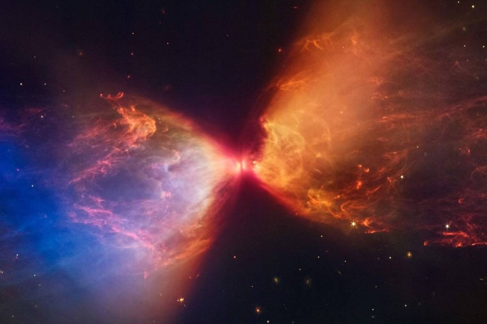 كشف تلسكوب جيمس ويب الفضائي عن صور جديدة مذهلة التقطها لسحابة ضخمة من الغبار على شكل ساعة رملية حول نجم في طور التكوّن.