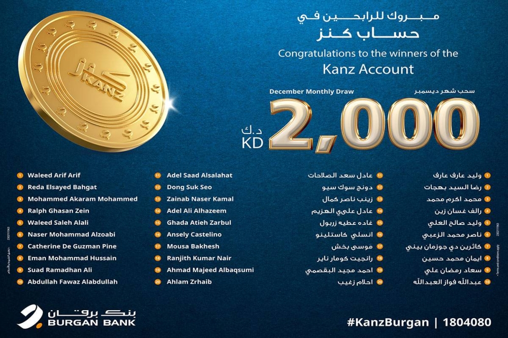 أعلن بنك برقان اليوم أسماء العشرين فائزاً في السحب الشهري لحساب كنز، الذين سيحصل كل منهم على جائزة نقدية بقيمة 2000 دينار كويتي.