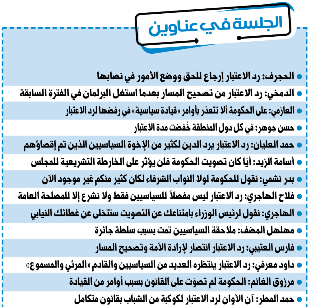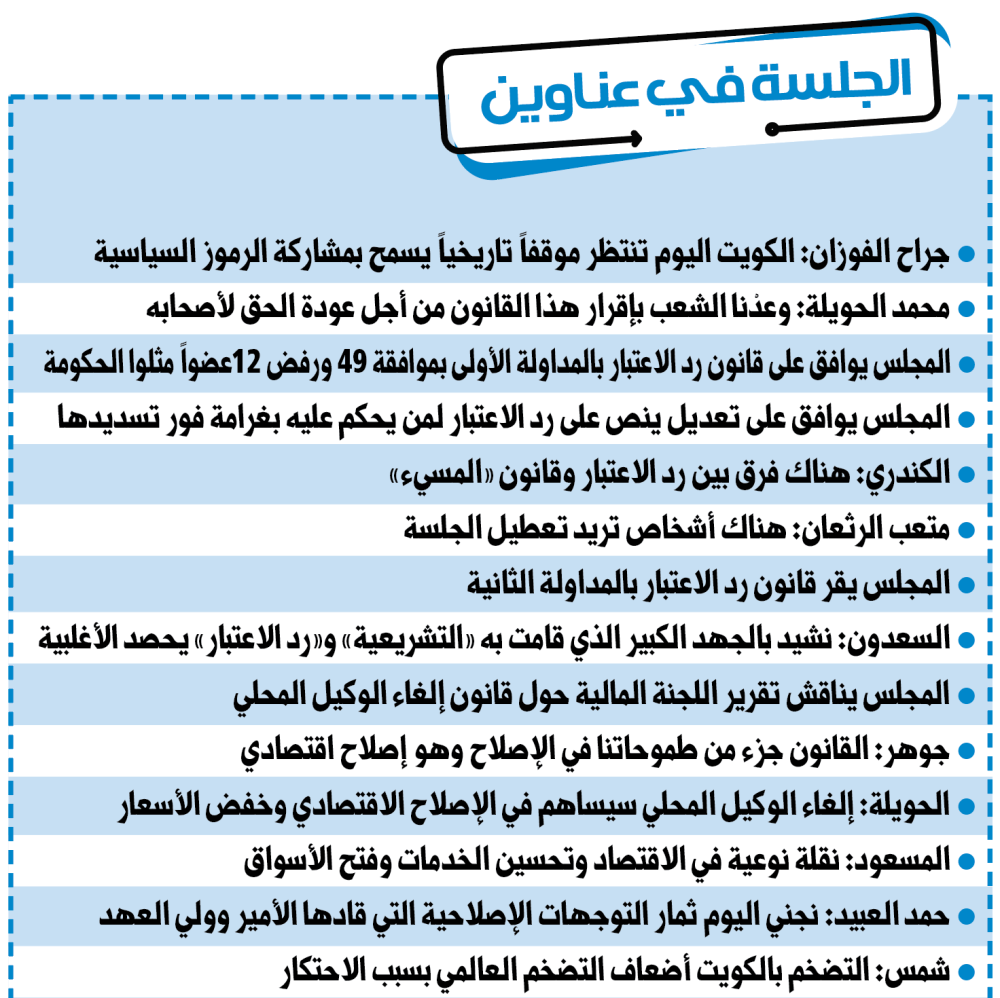 وأكد النائب حمد العليان أن «قانون رد الاعتبار يرد الدين لكثير من الاخوة السياسيين الذين تم إقصاؤهم في الحقبة السابقة، وأتمنى أن يقر في المداولتين».