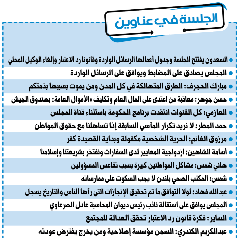 • الموافقة على رسالة من النائب حمدان العازمي بشأن تراجع أداء قطاع الإعلام في الأمانة العامة للمجلس وعدم وجود سياسة إعلامية واضحة وتكليف مكتب المجلس بالتحقيق في الموضوع.