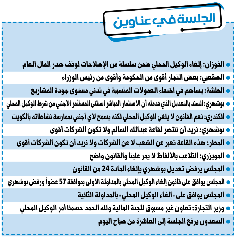ووافق المجلس على قانون «إلغاء الوكيل المحلي»، الذي ينص على عدم اشتراط دخول المستثمر الأجنبي من خلاله، بالمداولة الأولى بموافقة 57 عضواً ورفض جنان بوشهري، وصوّت على استثنائه من المادة 104 تمهيداً لإقراره بالمداولة الثانية، ليقر المجلس إلغاء الوكيل المحلي بالمداولة الثانية بموافقة 56 عضوا ورفض بوشهري ويحيله للحكومة.