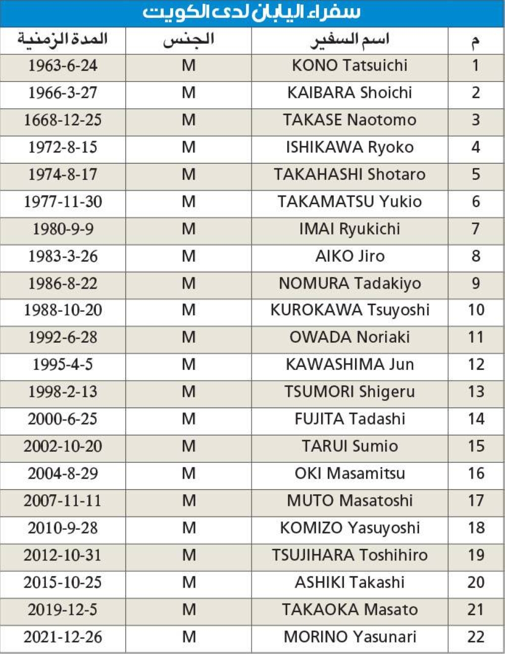 22 سفيراً يابانياً في الكويت منذ افتتاح السفارة إلى العام الحالي