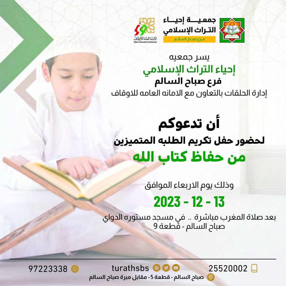 تطرح جمعية إحياء التراث الإسلامي، بالتعاون مع الأمانة العامة للأوقاف، برنامجاً ثقافياً يتضمن سلسلة من الدروس والمحاضرات والدورات العلمية والثقافية في العديد من المناطق خلال ديسمبر الجاري. وأشارت الجمعية، في بيان، اليوم، إلى تنظيم حفل لتكريم الطلبة المتميزين من حفاظ كتاب الله تعالى مساء اليوم بعد صلاة المغرب مباشرة بمسجد مستورة الدواي في صباح السالم.