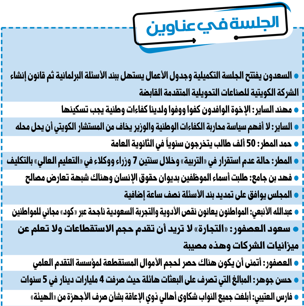 وبحسب قراره بجلسة أمس الأول فقد استهل المجلس جلسته أمس ببند الأسئلة، وكان أول المتحدثين النائب مهند الساير، الذي عقب على سؤاله لوزير الكهرباء بشأن المستشارين الوافدين، مشددا على أن «هذا السؤال وجهه إلى جميع الوزراء، فإحلال المستشارين بدأناه بمجلس الأمة والاخوة الوافدين كفوا ووفوا، ولكن لدينا كفاءات وطنية يجب تسكينها محل الوافدين».