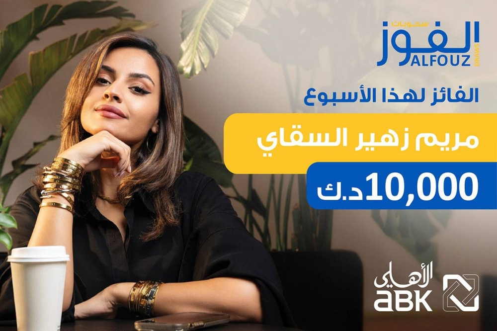 أعلن البنك الأهلي الكويتي فوز مريم زهير السقاي في السحب الأسبوعي لحساب الفوز للجوائز، بجائزة نقدية قدرها 10000 دينار، وأقيم السحب تحت إشراف وزارة التجارة والصناعة، وتم الإعلان عن اسم الفائز الاثنين 11 ديسمبر 2023.