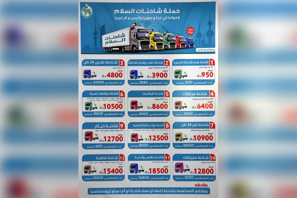 وقال رئيس مجلس إدارة الجمعية عضو مجلس إدارة الهيئة الخيرية الإسلامية العالمية الدكتور نبيل العون لـ«كونا» خلال الإطلاق إن حملة هذا العام تستهدف الوصول إلى عدد 500 شاحنة إغاثية للاسهام في تخفيف معاناة الأهل في تلك الدول مع دخول فصل الشتاء والنقص الشديد بالمستلزمات والمواد الضرورية.