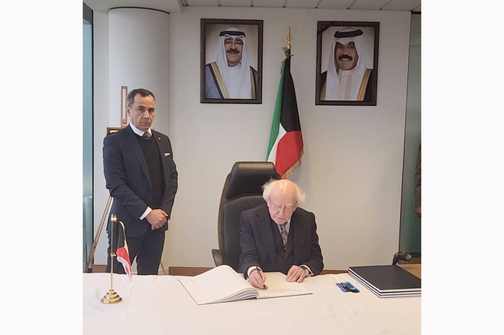توافد كبار المسؤولين في جمهورية أيرلندا إلى مقر سفارة الكويت في العاصمة دبلن، على مدار ثلاثة أيام، لتقديم التعازي بوفاة المغفور له بإذن الله الأمير الراحل الشيخ نواف الأحمد الجابر الصباح طيّب الله ثراه حيث كان في استقبالهم السفير محمد المحمد وأركان السفارة.