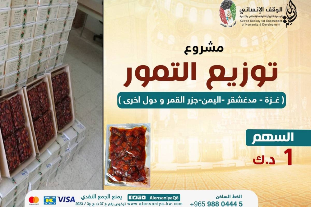أطلقت الجمعية الكويتية للوقف الإنساني والتنمية مشروع توزيع التمور لدعم المحتاجين في غزة واليمن ومدغشقر وجزر القمر وعدة دول.