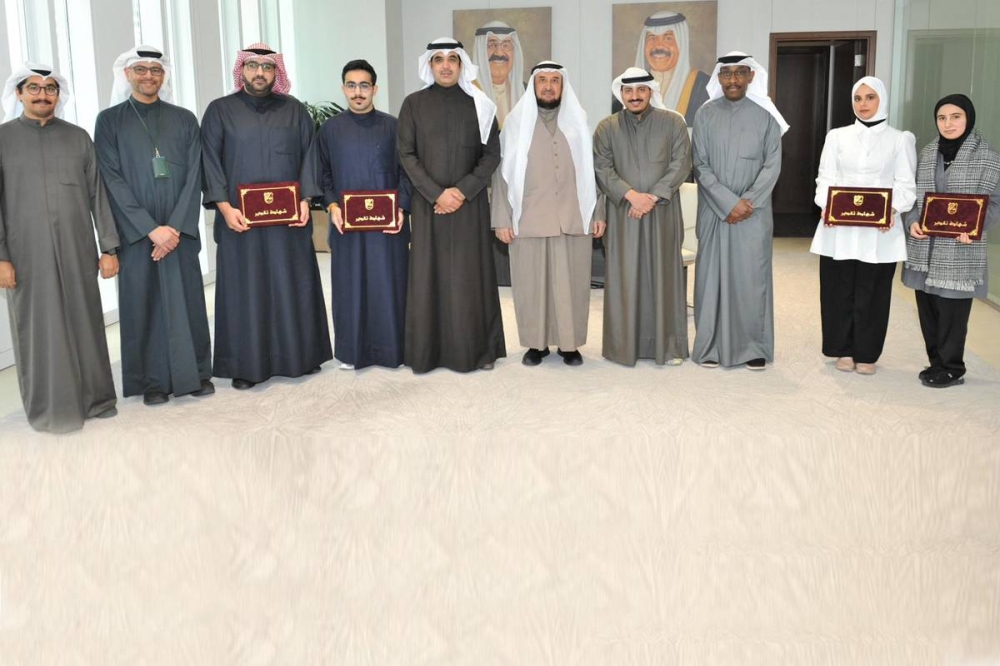 من جهة أخرى، نظمت عمادة شؤون الطلبة تكريماً للطلبة الفائزين بالمسابقة القانونية الأولى للعام الجامعي 2024/2023، التي أقامتها إدارة الشؤون الطلابية- قسم القضايا والشكاوى بالعمادة، بحضور الأمين العام لجامعة الكويت بالإنابة الأستاذ الدكتور فايز الظفيري، والقائم بأعمال عميد شؤون الطلبة الأستاذ الدكتور جاسم الحمدان، ومدير إدارة الشؤون الطلابية فالح المسعود، ومدير إدارة الشؤون القانونية حمود البسام، بمكتب الأمين العام في المبنى الإداري بمدينة صباح السالم الجامعية.