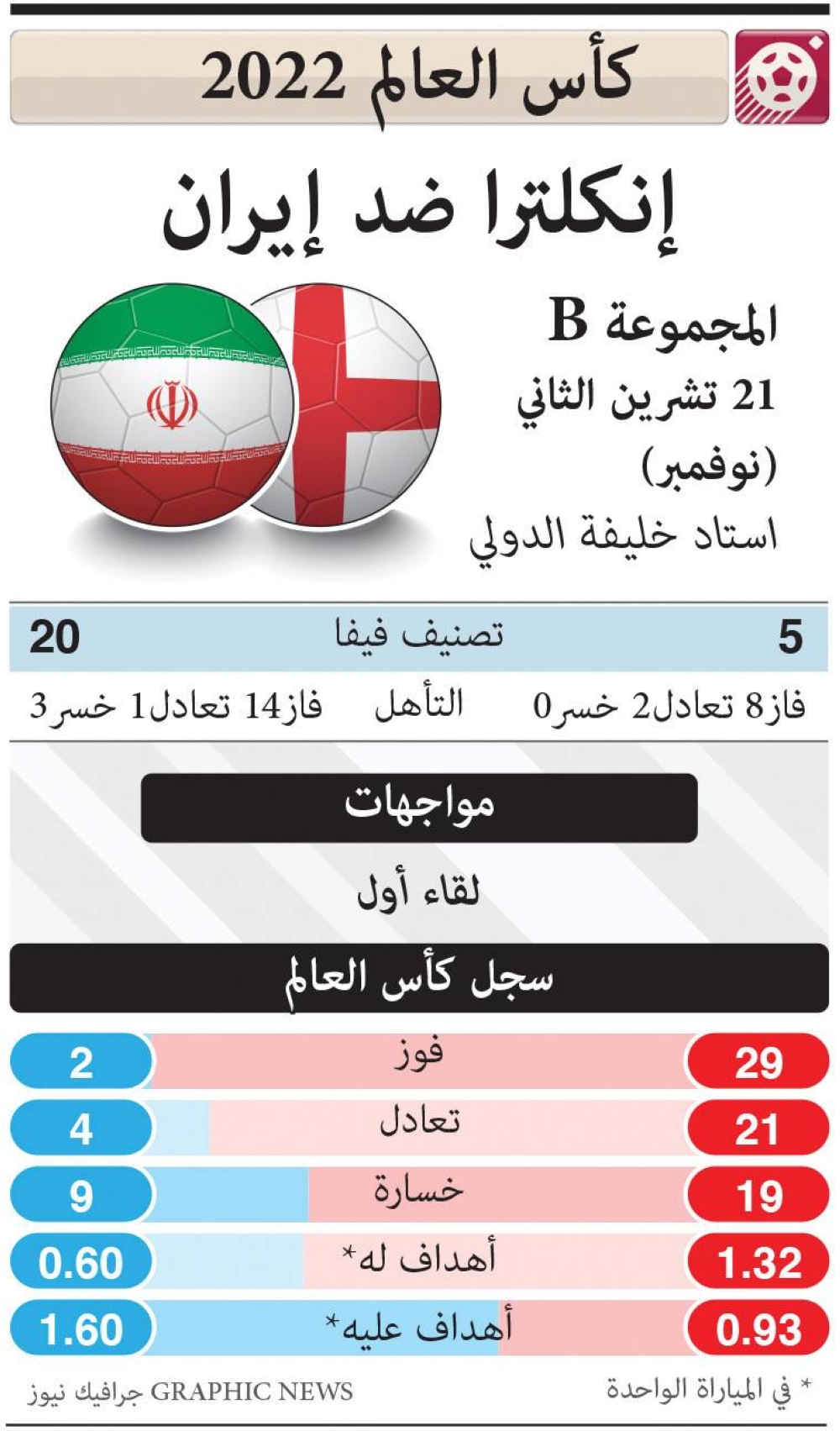 وسيكون من الصعب على الإيرانيين في أفضل أيامهم أن يقارعوا الإنكليز في ظل وجود كين والمتألق بوكايو ساكا وفيل فودن في خط المقدمة، لكن «الأسود الثلاثة» يصلون الى قطر على خلفية 6 مباريات متتالية من دون فوز في سلسلة هي الأسوأ لهم منذ 1993.