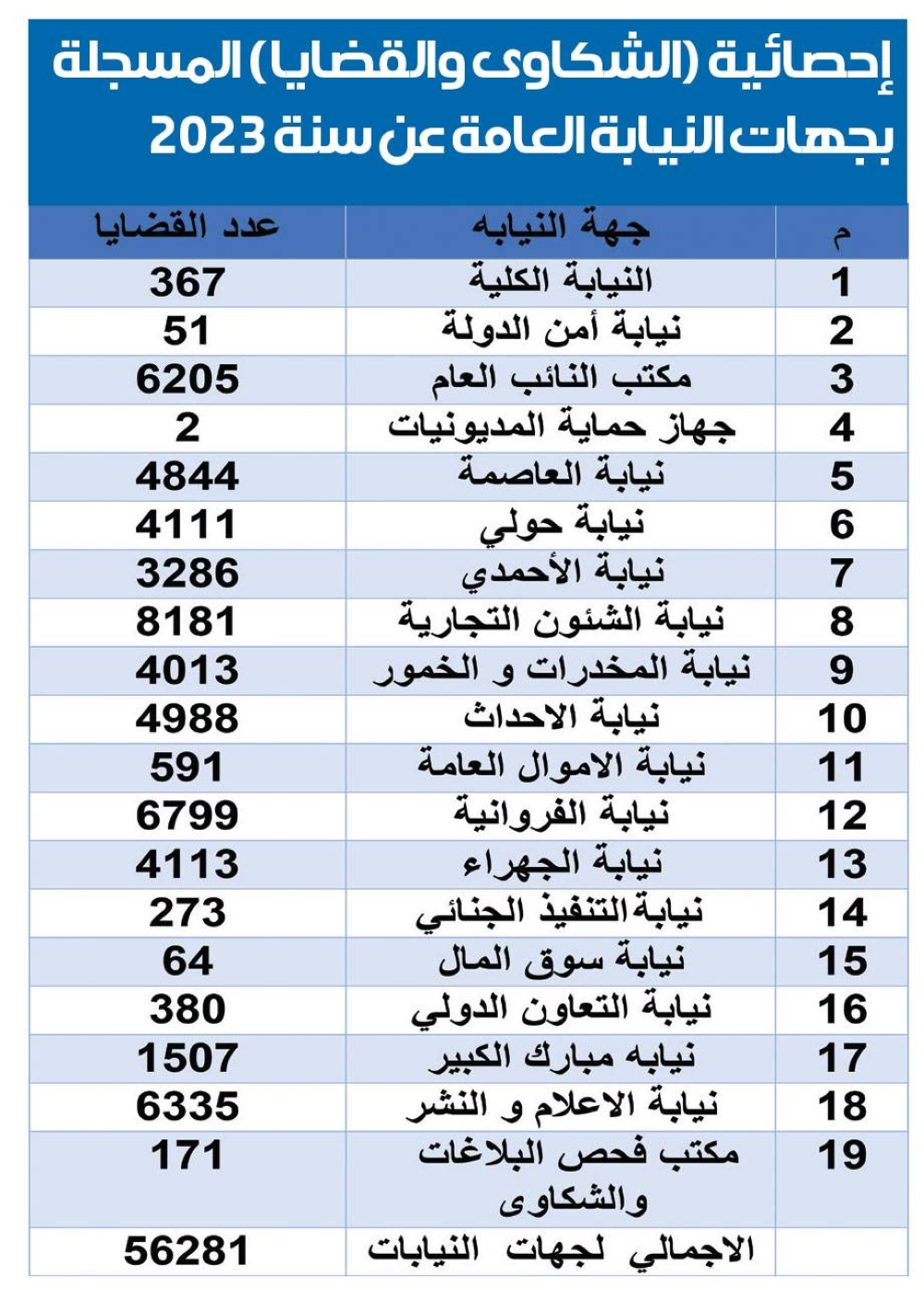 وفيما يخص جهود النيابة العامة خلال العام الماضي، بيّن أن النيابة تلقت عام 2023 أكثر من 56281 قضية وشكوى، منها 367 قضية في النيابة الكلية و51 قضية في نيابة أمن الدولة و6205 قضايا في مكتب النائب العام، و591 في نيابة الأموال العامة و4988 قضية في نيابة الأحداث و4013 في نيابة المخدرات والخمور و380 قضية في نيابة التعاون الدولي و6335 في نيابة الإعلام والنشر، وغيرها العديد من القضايا والشكاوى بمختلف النيابات.