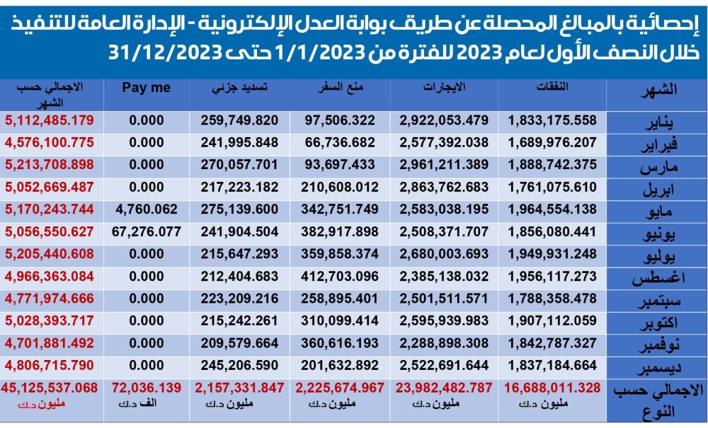 وكشف القلاف، في تصريح، استعرض خلاله إحصائية عن إنجازات الوزارة خلال الفترة من 1/ 1/ 2023 وحتى 31/ 12 منه، أن المبالغ المحصّلة خلال تلك الفترة عن طريق البوابة الإلكترونية (الإدارة العامة للتنفيذ) زادت على 45 مليوناً و125 ألف دينار.