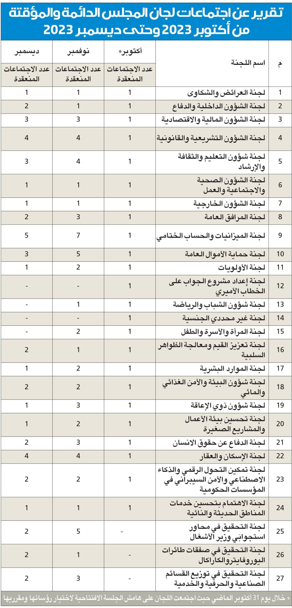 على سبيل المثال، لم تعقد لجنة غير محددي الجنسية أي اجتماعات في شهري نوفمبر وديسمبر، ورصيدها صفر اجتماعات، والاجتماع اليتيم الذي عقدته كان شكلياً في أكتوبر لاختيار الرئيس والمقرر، ولا يختلف الحال كثيراً بالنسبة للجنة تحسين الخدمات التي لم تجتمع سوى مرة واحدة في نوفمبر ومثلها في ديسمبر، وإلى جانبهما خالفت على صعيد اللجان المؤقتة كل من «الشباب والرياضة التي اجتمعت مرة في نوفمبر وصفر في ديسمبر، وتعزيز القيم والتحقيق باليوروفايتر باجتماعها مرة واحدة خلال نوفمبر، في حين خالفتها خلال ديسمبر كل من لجنة المرأة والأسرة برصيد صفر، و«الموارد البشرية» و«الإعاقة» و«تحسين بيئة الأعمال»، باجتماع واحد خلاله.