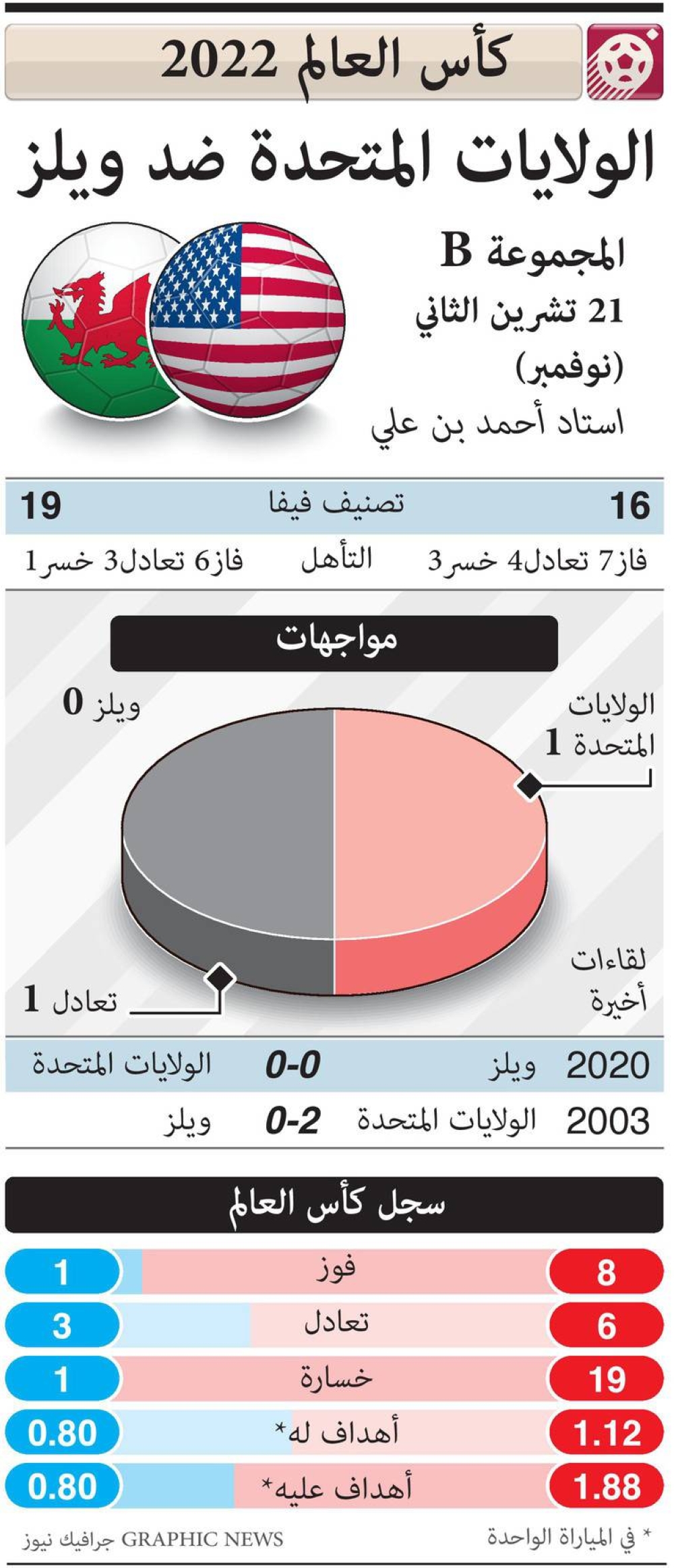 أما منتخب ويلز، الذي يقوده المدرب روبرت بيج، ويحتل المركز التاسع عشر في تصنيف الفيفا، فيطمح إلى أن يصنع مفاجأة مبكرة في البطولة، بعد 64 عاماً من الغياب عن كأس العالم.
