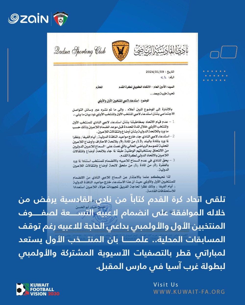 من جانبه، اكتفى الاتحاد الكويتي لكرة القدم ببيان على حسابه في منصة «X»، أكد خلاله تلقيه كتابا من نادي القادسية «نشر صورته» برفضه الموافقة على انضمام لاعبيه إلى المنتخبين بداعي الحاجة لهم.
