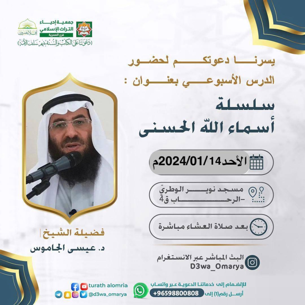 نظمت جمعية إحياء التراث الإسلامي سلسلة من الدروس التوجيهية والثقافية والدعوية خلال يناير الجاري، منها درس أسبوعي في شرح «سلسلة أسماء الله الحسنى» ألقاه اليوم الشيخ د. عيسى الجاموس بعد صلاة العشاء في مسجد نوير الوطري بمنطقة الرحاب.