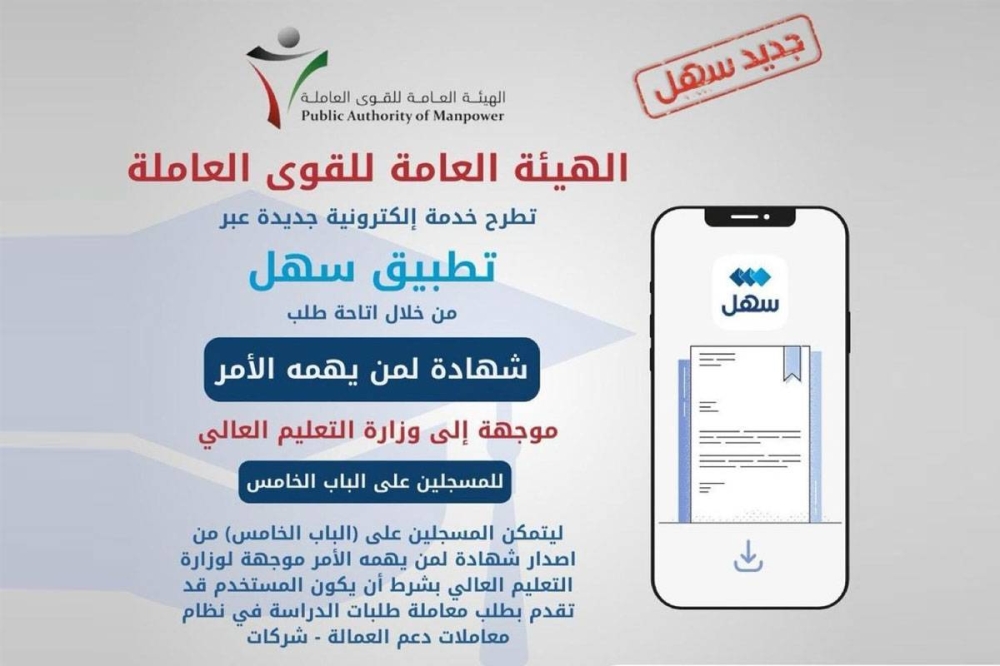 أعلن المتحدث الرسمي باسم التطبيق الحكومي الموحد للخدمات الإلكترونية (سهل)، يوسف كاظم، إطلاق الهيئة العامة للقوى العاملة خدمة إلكترونية جديدة عبر التطبيق تتمثل في «إتاحة شهادة لمن يهمه الأمر لوزارة التعليم العالي - للباب الخامس» مباشرة عبر «سهل».