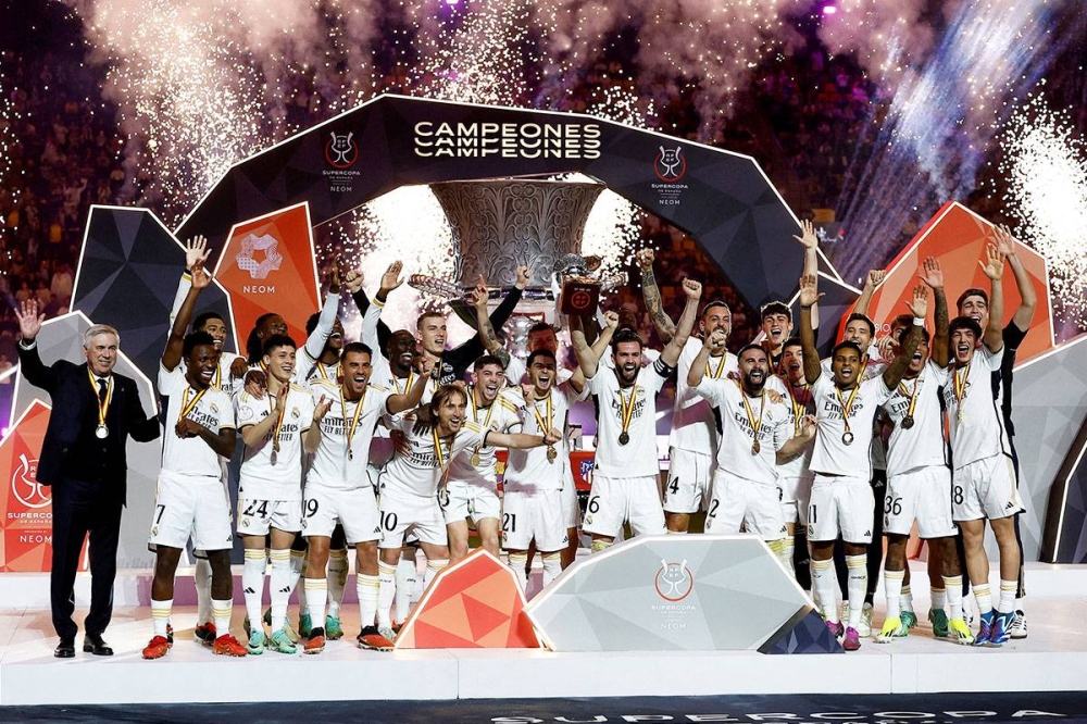 تُوِّج ريال مدريد بلقب كأس السوبر الإسبانية للكرة القدم للمرة الثالثة عشرة في تاريخه، محققاً نصراً مزدوجاً، بعدما اكتسح غريمه برشلونة 4-1 في ليلة صاخبة، بقيادة النجم البرازيلي فينيسيوس جونيور، الذي سجل «هاتريك» في الشوط الأول على ملعب «الأول بارك» الخاص بنادي النصر في مدينة الرياض السعودية أمس الأول.