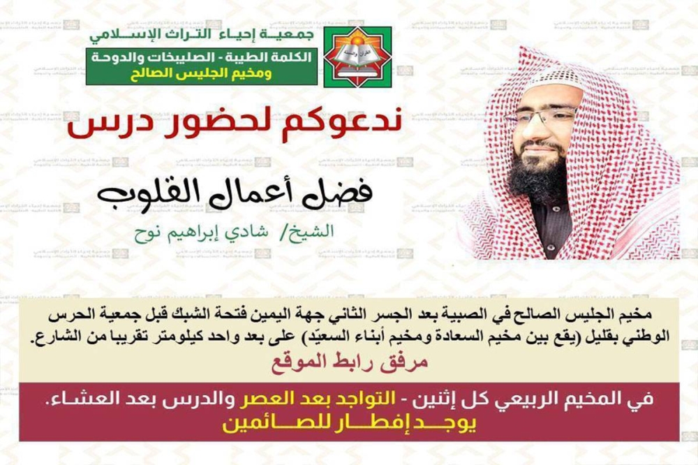 وأشارت الجمعية، في بيان اليوم، إلى تنظيم درس أسبوعي للشيخ شادي نوح بعنوان «فضل أعمال القلوب» مساء كل يوم اثنين بعد صلاة العشاء في مخيم الجليس الصالح الذي يشرف عليه فرع الجمعية في الصليبيخات والدوحة، ويقع في منطقة الصبية بعد الجسر الثاني.