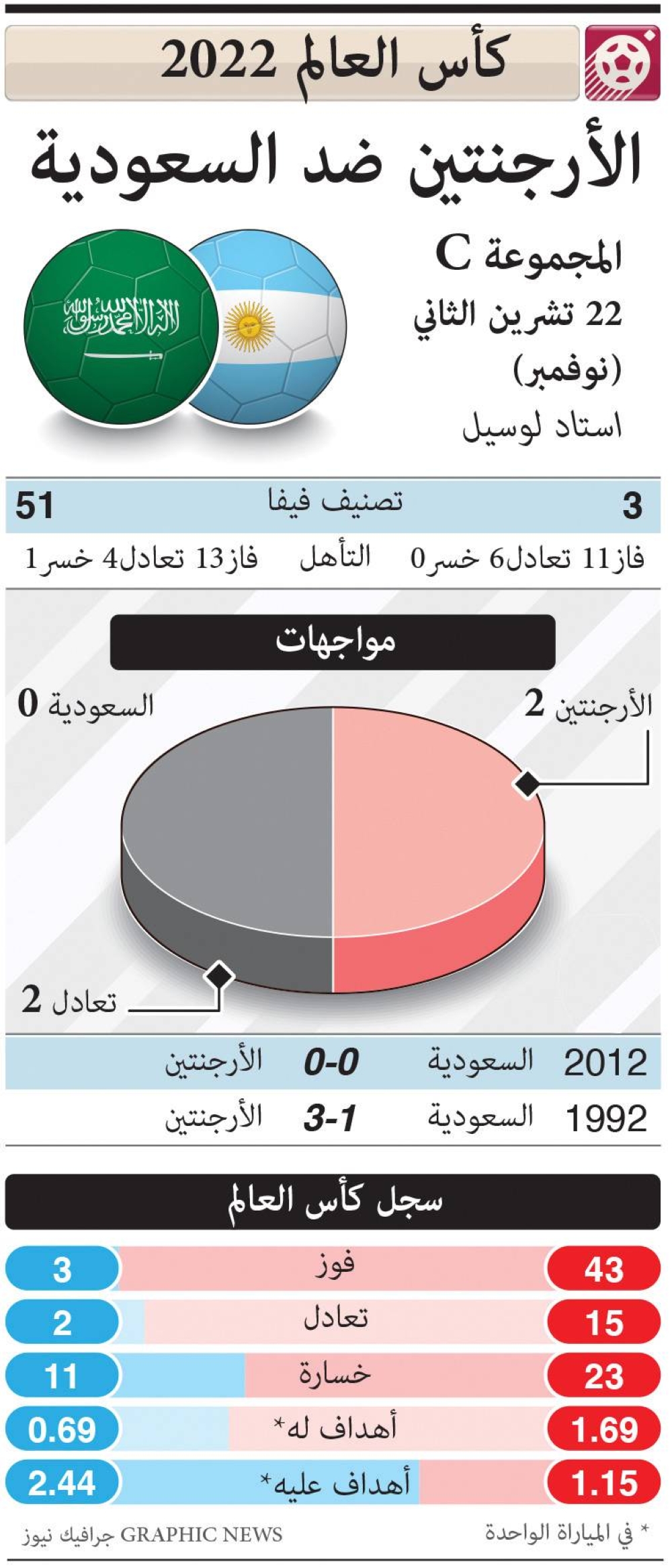 وتخوض الأرجنتين غمار هذه البطولة متسلحة بسلسلة من 36 مباراة دون خسارة على مدى السنوات الثلاث الأخيرة. وفي حال قُدِّر لها الفوز على السعودية، فإنها ستعادل الرقم القياسي الموجود بحوزة المنتخب الإيطالي.