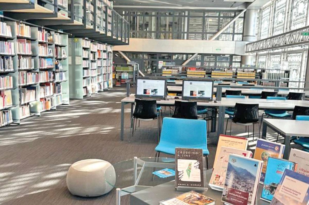 ونحن في طريقنا إلى مكتبة المعهد، والتي تشغل ثلاثة طوابق من المبنى، وفيها ثلاث قاعات، قمنا بجولة ميدانية للتعرف عليها، ترافقك سيدة تتحدث العربية قليلا، تشرح عن برج الكتب وهو عبارة عن درج لولبي استوحاه المصمم الفرنسي من تاريخ العمارة والثقافة عند العرب، تصحبك فيه الكتب صعودا ونزولا، وفي مكتبة تحوي حوالي 80 ألف كتاب وباللغات الفرنسية والعربية والانكليزية، نصفها باللغة العربية.