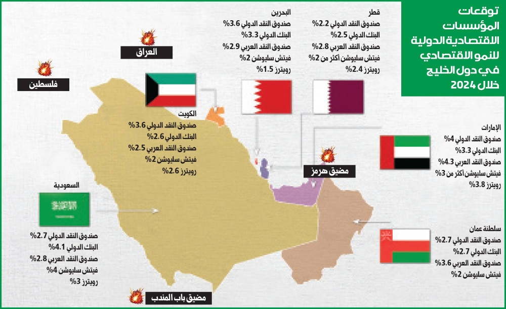 أيضاً توقعت وكالة «فيتش سليوشنز» أن تقود الإمارات والسعودية النمو الخليجي بنحو 4 في المئة للأولى، وأكثر من 3 في المئة للثانية، وإلى نحو 2 في المئة للكويت، والبحرين، وعمان، وأكثر منها لقطر، كما أظهر استطلاع أجرته «رويترز» شمل 20 اقتصادياً أن متوسط النمو الخليجي بوجه عام سيسجل 3.5 في المئة، ما يعد أعلى كثيراً من معدل النمو المسجل خلال 2023 والبالغ 0.8 في المئة، وأن المملكة العربية السعودية قد تنمو بنسبة 3 في المئة، بينما توقع الاستطلاع نمو الإمارات العربية المتحدة بنسبة 3.8 في المئة، في حين يتوقع اتساع النمو في قطر إلى 2.4 في المئة، وفي الكويت عند 2.6 في المئة، وأدنى في البحرين عند 1.5 في المئة، أما تقديرات النمو التي جاءت بناء على قاعدة بيانات صندوق النقد العربي واستبيان آفاق الاقتصاد العربي فجاءت كالتالي: السعودية 2.8 في المئة فقط، والإمارات 4.3 في المئة، وقطر 2.8 في المئة، والكويت 2.5 في المئة، وعمان 3.6 في المئة، والبحرين عند 2.9 في المئة.
