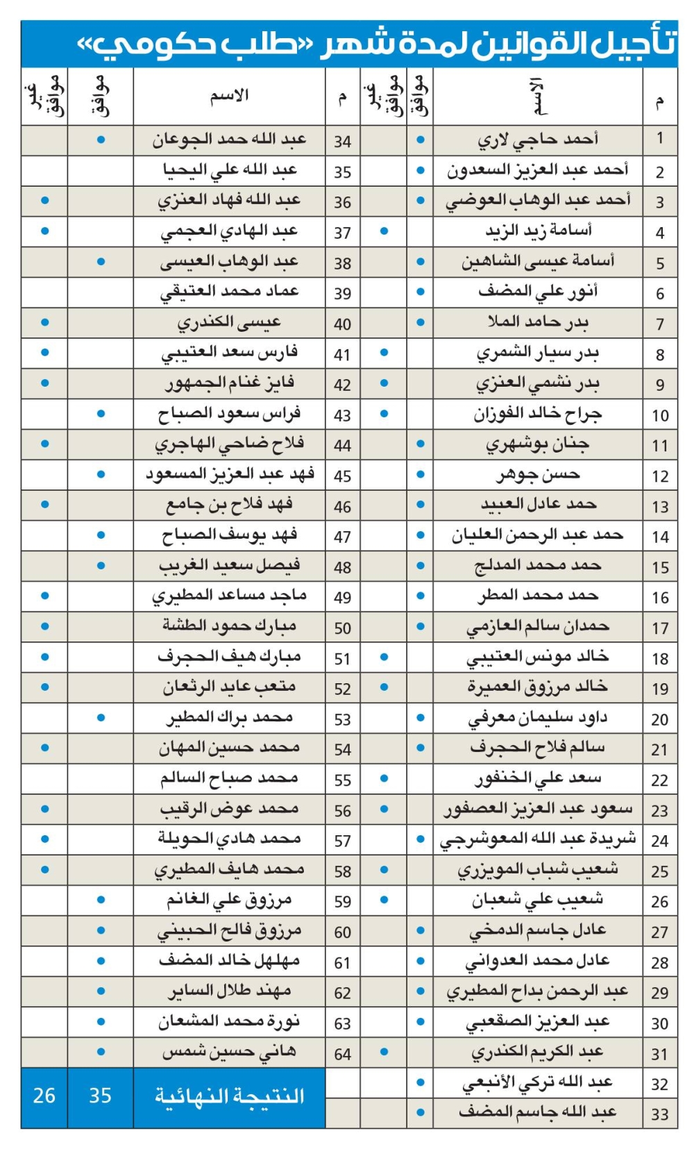 وقال المويزري: «طلبنا تضمن تقديم مخصصات الأمير، ومن ثم مناقشة زيادة القرض الحسن وزيادة غلاء المعيشة»، وانتقل المجلس إلى التصويت على الطلب نداء بالاسم، ورفضه المجلس بموافقة 30 ورفض 32.